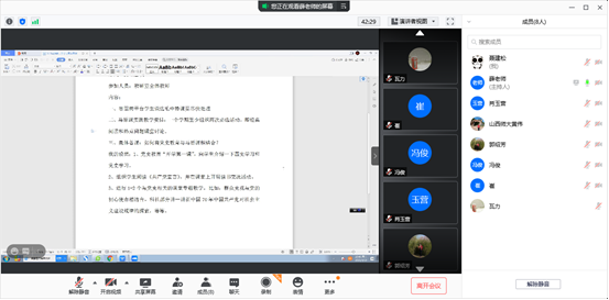 2021年3月13日晚20:00—21:00,纲要教研室组织召开会议,由教研室主任聂传平主持,教研室老师参加会议并积极发言、讨论,提出了很多有价值的思路与建议。会上,赵改萍副经理首先提出“纲要”课教师需要在教学中自觉将“中国共产党始终不渝为人民的初心使命”这个主题有机融入授课内容中;赵秀芳老师和王新中老师分别从正反两方面表达了人民群众的重要性;会议一致认为要讲好中国共产党的初心使命,让员工有更直观、深刻的理解。