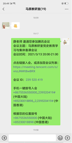 同一时间,马原教研室也召开会议。在会议中就如何将党史教育与马原课相结合进行了深入的讨论,提出了要将党史材料运用到课堂教学案例中、组织员工阅读马克思主义经典著作、将党史与课堂专题教学相结合、播放一些党史方面的视频资料等一些可行性的有效措施。