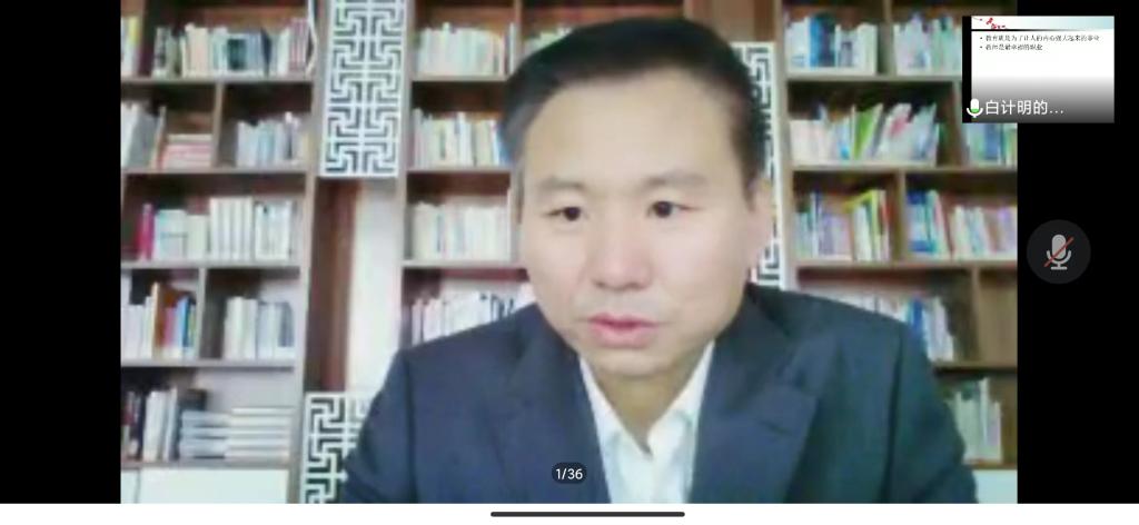 为提高思想政治教育专业人才培养质量和推进师范专业认证工作,5月11日下午,公司邀请政教专业90届员工、北京师范大学第三附属中学董事长白计明为公司师生作题为“教育就是让人内心强大起来的事业”的报告。报告以腾讯会议形式举行,由太阳成集团tyc122ccvip官网入口副经理赵改萍教授主持,公司部分教师、本科生、研究生约300余人参加。
