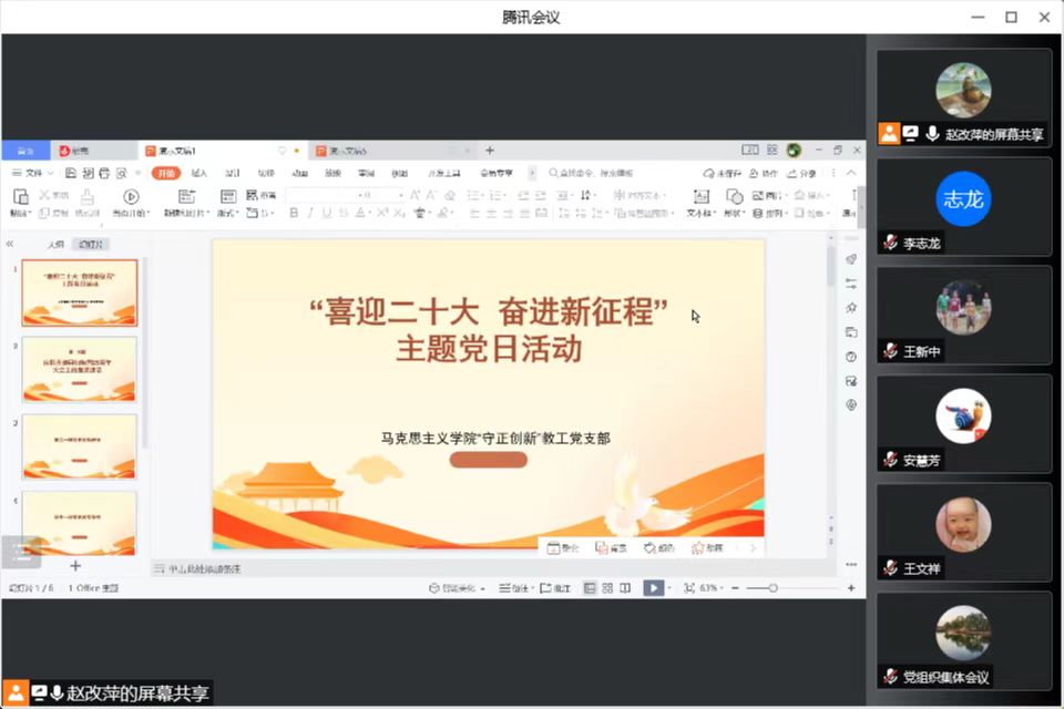 在中国共产党成立101周年之际,公司“守正创新”教工党支部于2022年7月1日晚7点半在腾讯会议开展“喜迎二十大 奋进新征程”主题党日活动。此次主题党日活动由支部书记赵改萍主持,支部全体党员参加。支部联系校领导太阳成集团tyc122ccvip纪委书记党志峰莅临指导。