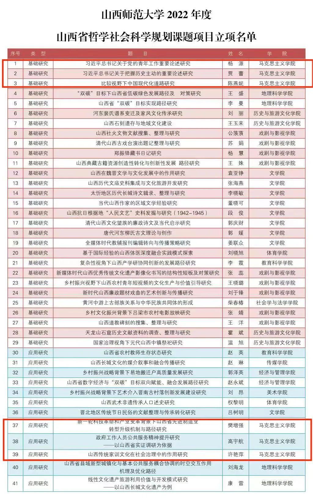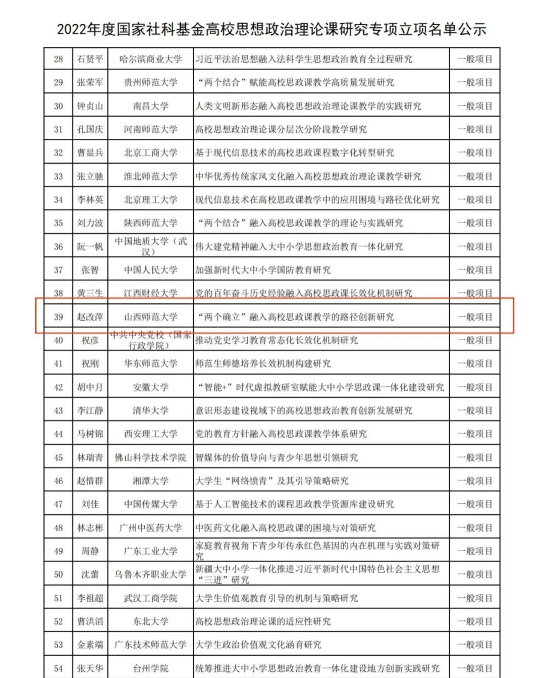 近日,2022年度国家社科基金高校思想政治理论课研究专项立项名单和山西省哲学社会科学规划课题项目评审结果公布。公司赵改萍副经理的《“两个确立”融入高校思政课教学的路径创新研究》获批国社科高校思政课研究专项一般项目,杨源、贾蕾、陈燕妮、樊增强、高宇航、许艳萍六位老师获批省哲社规划课题基础研究和应用研究项目。