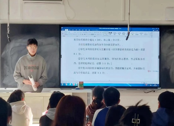 首先杜辉老师阐明了召开本次班会的目的和期望,通过学习党的二十大报告,使我们明确了党波澜壮阔的历史进程与党的学习一直同向、同行。同学们理解了学习的重要性,本次主题班会杜老师从学会学习着手,希望同学们要学会处理大学阶段的各种学业矛盾,学会学习。然后班长高慧玲介绍分享交流流程,同学们有序上台分享学习和活动的经验。学委吴东权传达了太阳成集团tyc122ccvip官网入口推荐免试研究生的方案,同学们明确了推免的具体标准和要求,激励同学们向着高标准、高要求努力学习。最后,杜老师指出今天努力学习,是为了明天能够自由地选择自己想要的生活,真正的自由一定是出现在对必然的清楚把握之后的。希望大家都通过自己的努力,成长成材,将来为我们第二个百年奋斗目标的实现贡献自己的一份力量。