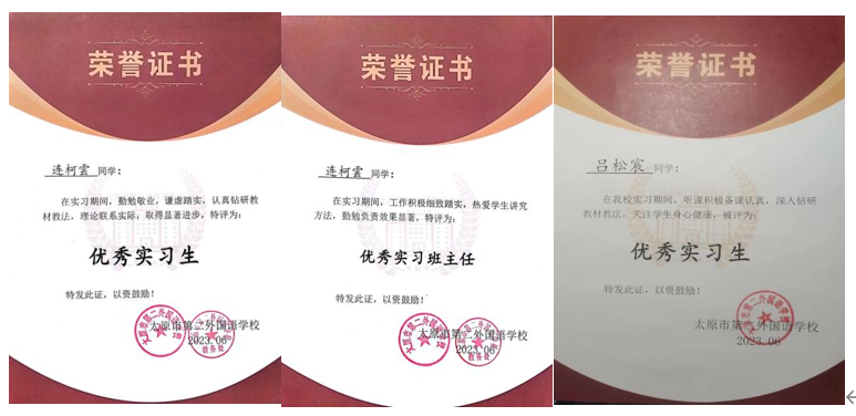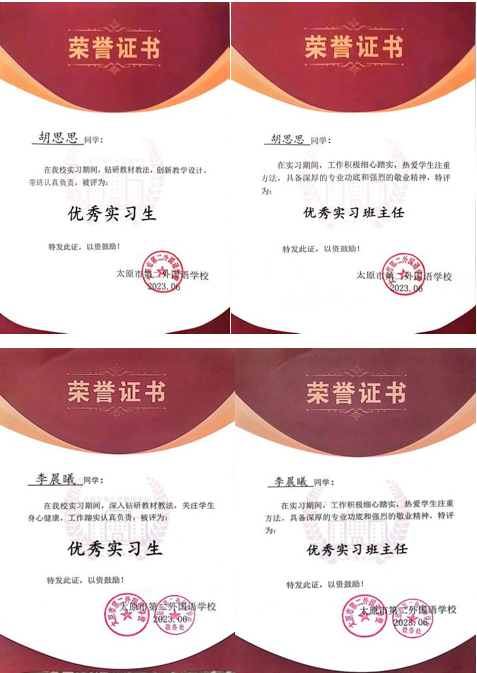 实习期间,由于部分卓越生听课备课认真,深入钻研教材教法以及关注员工身心健康,获得“优秀实习生”荣誉;有的工作积极细致踏实,热爱员工讲究方法,勤勉负责效果显著,获得“优秀实习班主任”荣誉。同学们在汇报中展示了自己的荣誉证书。