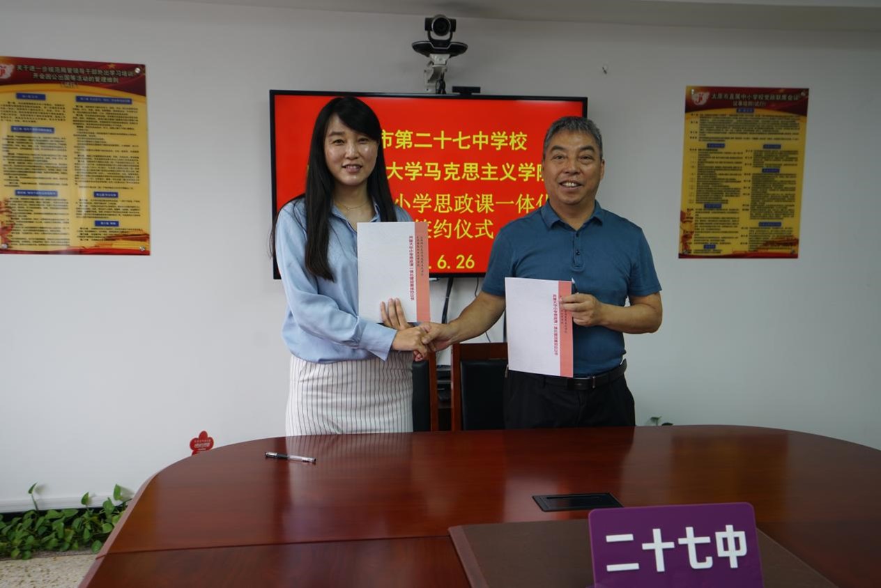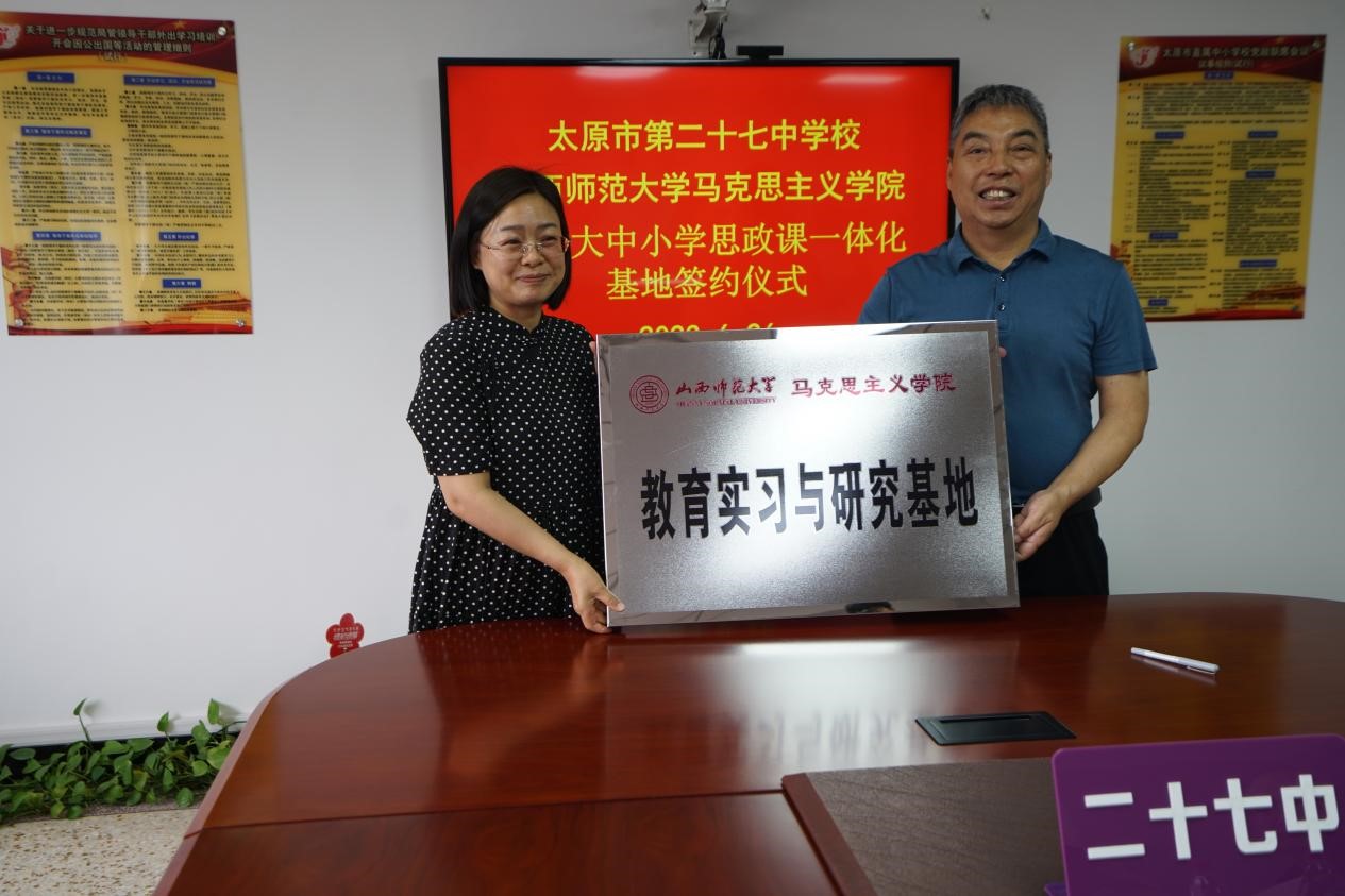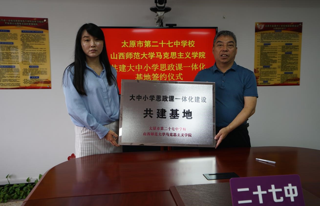 2023年6月26日上午,太阳成集团tyc122ccvip官网入口与太原市第二十七中公司大中小学思政课一体化建设共建基地、教育实习与研究基地签约授牌仪式在太原市第二十七中公司隆重举行。
