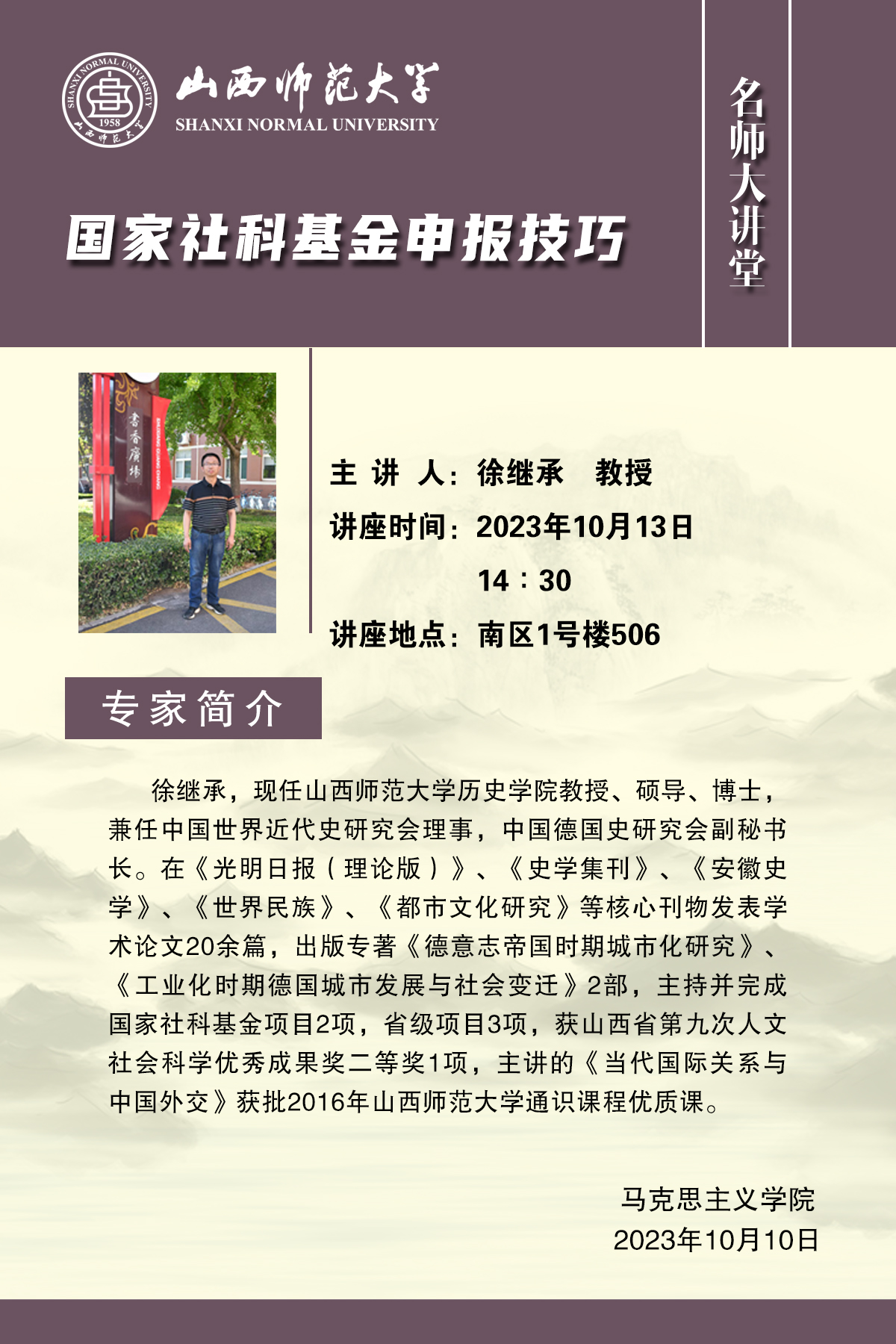 10月13日下午,太阳成集团tyc122ccvip官网入口邀请公司历史与旅游文化公司徐继承教授在1506会议室举办了《国家社科基金申报心得与体会》的专项座谈交流。徐继承教授结合自身三次成功申报国家社科基金项目的实际,从准确定位基金类型、精准把握选题、强化推进论证等三个方面,与参会教师分享了他的成功经验与心得体会。