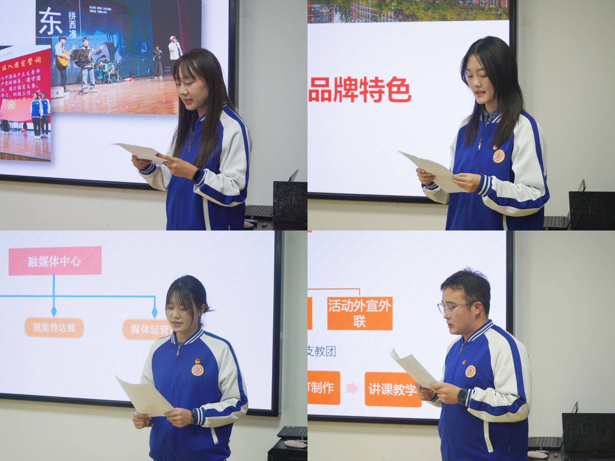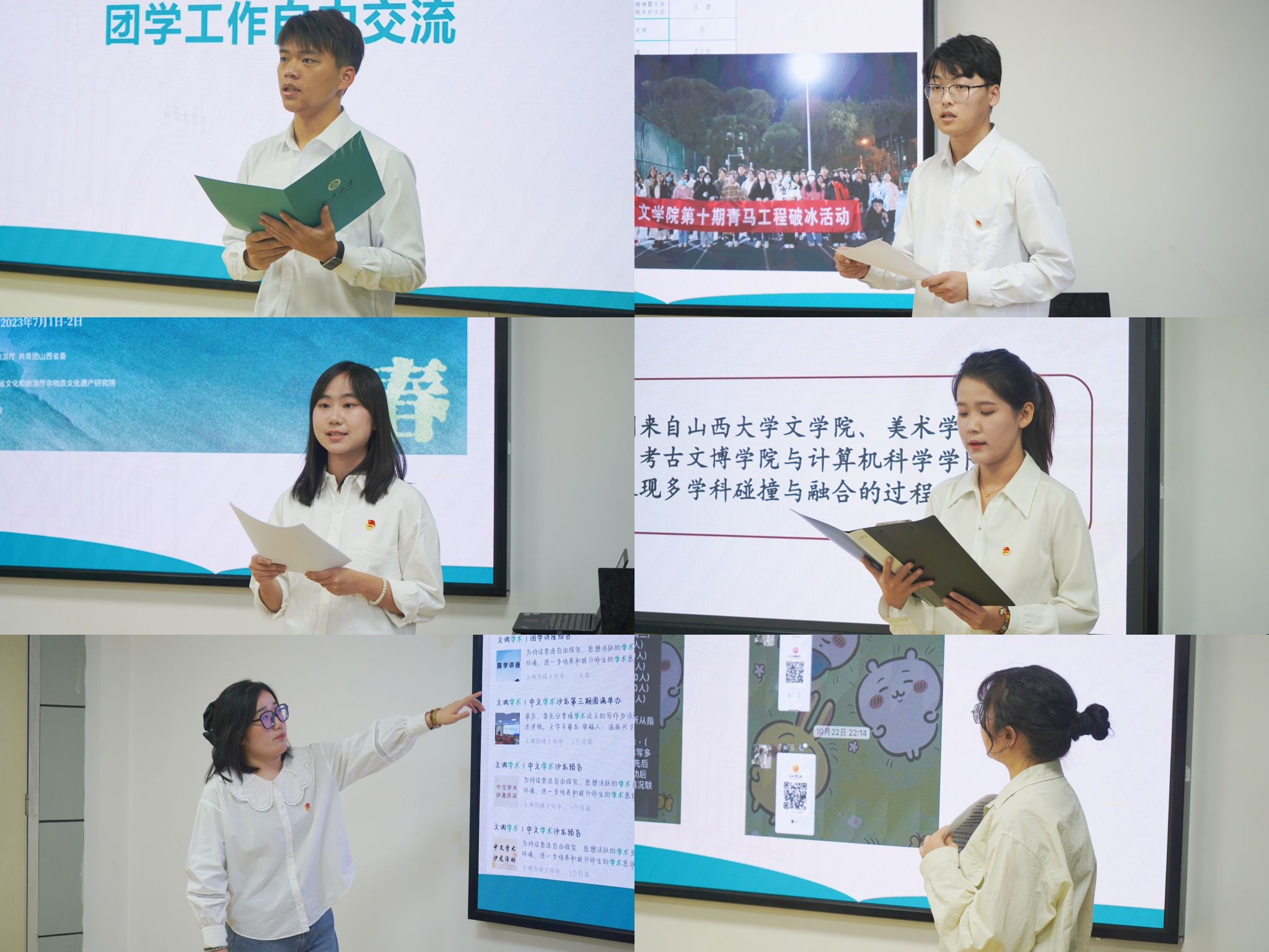 山西大学文公司员工团委副书记任书轩从团学制度、基层支部、青马活动、团学阅读栏目四个方面分享了文学经理期以来的团学建设工作成果。山西大学文公司员工会主席团成员吴月佳介绍了山西大学文公司员工会的工作情况,从员工会组织架构与工作出发,重点介绍了由文公司承办的2023年山西省老员工“非遗正青春”校园演说大赛和华北五省(市、自治区)老员工人文知识竞赛这两个大型比赛活动以及取得的工作成效。其中,山西大学“五龙寻梦”创业创新团队负责人焦雅馨同学介绍了团队的详细工作:在初识五龙中讲述创作初衷和调研故事,在多彩五龙中介绍团队开发的一系列产品,在数字五龙中解读数字平台的出发点和立足点,在聆听五龙和遇见五龙中讲述数字化传承与创新。山西大学文公司青年媒体中心李旸就最近的工作安排,从下设部门和工作风采总结了青年媒体中心长期以来改革探索出来的工作体质和方法,向大家分享了一些工作中的有益经验。山西大学文公司青年志愿者协会负责人郭冬雪则详细介绍了青年志愿者协会的下设部门及其基本的工作职能和举办的特色活动。