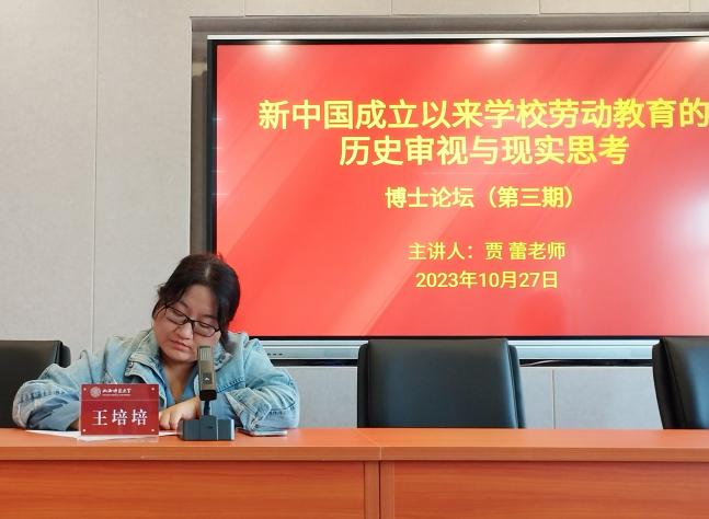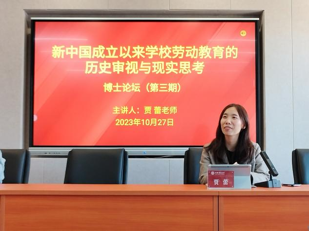 接着,贾蕾老师作了题为《新中国成立以来公司劳动教育的历史审视与现实思考》的报告。她以新中国成立为背景,从文章的选题缘由、写作思路出发,着重分析为什么要开展公司劳动教育,怎样开展公司劳动教育,讲述了公司劳动教育的内容、途径、教学目标等重要内容,同时指出了公司劳动教育的发展现状以及存在的问题。她表示,公司劳动教育与社会现实状况、与中央导向密切相关,应促进强国与育人的深度融合,理解中华民族伟大复兴与公司劳动教育的紧密联系,弘扬新时代劳模精神、劳动精神和工匠精神,进行创造性劳动教育,把新时代劳动教育的育人效果与育人价值鲜明的体现出来,让员工成为堪当民族复兴大任的时代新人,使员工成为社会主义建设者和接班人。