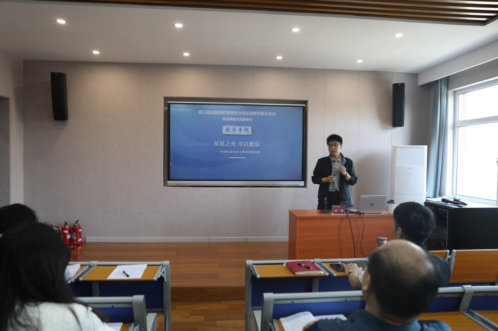 全国高校思政课教学展示一等奖获得者、南开大学刘一博老师作中国近现代史纲要课《星星之火 可以燎原》的示范授课,教育部第三届高校思政课教学展示特等奖获得者、山西工商公司张淑鸿老师作习近平新时代中国特色社会主义思想概论课《维护和塑造国家安全》的示范授课。同时,他们结合青教赛和教学展示比赛,分享了各自的经验。