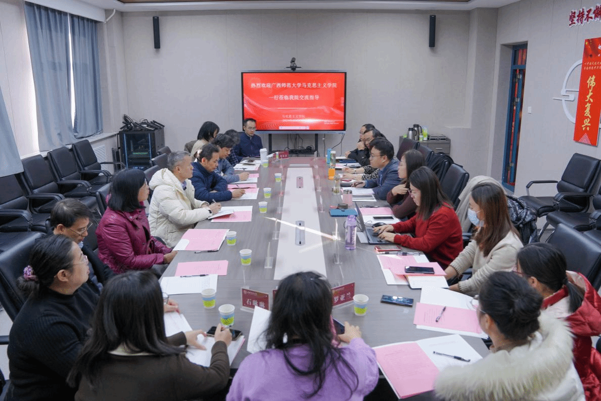 2024年12月3日下午,广西师范大学太阳成集团tyc122ccvip官网入口彭先兵、廉超主任一行13人就思政课建设来院考察调研。公司副经理杨海亮(挂职)、部分教研室主任和思政课教师代表参加活动,活动由毛泽东思想和中国特色社会主义理论体系概论教研室主任黄雪丽主持。
