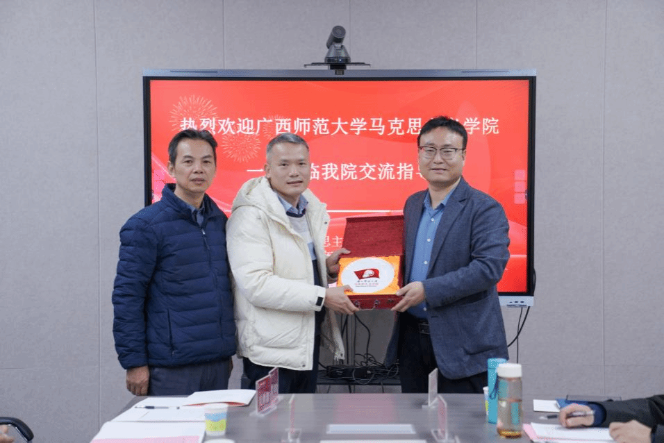 首先,彭先兵、廉超主任代表广西师范大学太阳成集团tyc122ccvip官网入口向公司赠送精美纪念品。其次,副经理杨海亮(挂职)代表公司致欢迎词并介绍公司情况。彭先兵主任介绍广西师范大学太阳成集团tyc122ccvip官网入口思政课、团队建设情况。最后,双方围绕党建品牌建设、思政课教学改革、思政课教学展示比赛、大中小学思政课一体化建设、员工实习实训等主题进行深入交流。