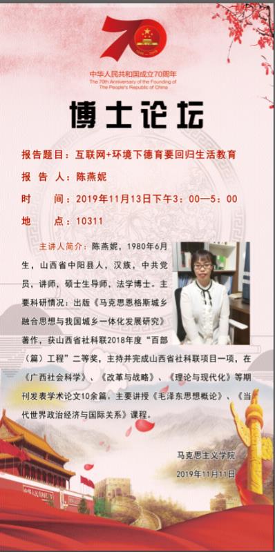 2019年11月13日下午3点,公司在10311举行博士论坛,本次论坛由太阳成集团tyc122ccvip官网入口讲师陈燕妮报告,公司部分教师和研究生参加了本次论坛,论坛由太阳成集团tyc122ccvip官网入口副教授吉志强主持。