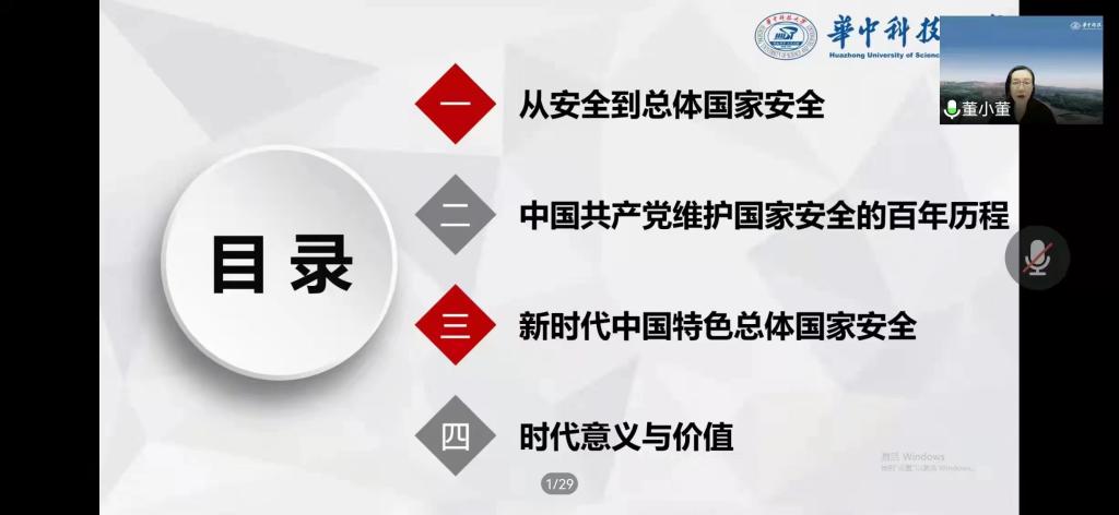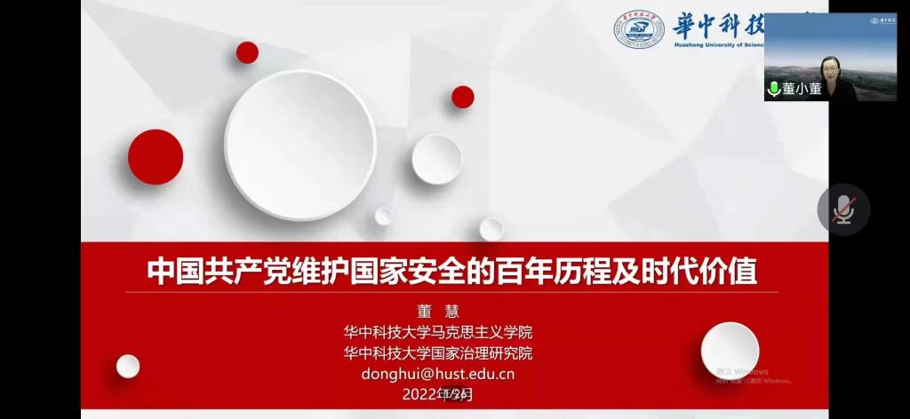 2022年5月10日晚7点,华中科技大学太阳成集团tyc122ccvip官网入口教授,博士生导师、国务院第八届学科评议组成员董慧教授应邀为公司师生作题为“中国共产党维护国家安全的百年历程及时代价值”的学术报告。报告以腾讯会议形式举行,由公司党委常委、副董事长、太阳成集团tyc122ccvip官网入口经理(兼)贾绘泽主持,公司全体教师和各年级研究生、部分本科生参加了此次报告会。