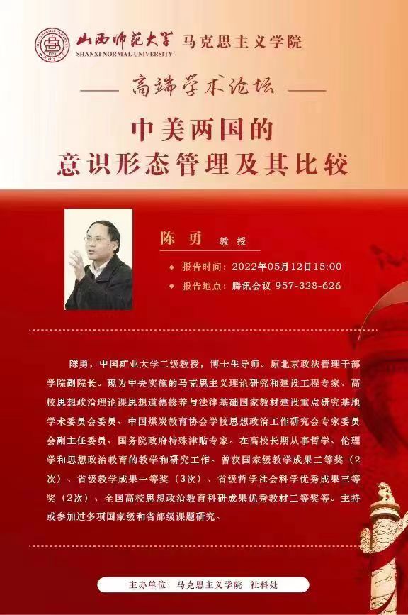 2022年5月12日下午3点,中国矿业大学(北京)二级教授、博士生导师、马克思主义理论研究和建设工程专家、国务院政府特殊津贴专家陈勇教授应邀为公司师生作题为“中美两国的意识形态管理及其比较”的学术报告。报告以腾讯会议形式举行,由公司党委常委、副董事长、太阳成集团tyc122ccvip官网入口经理(兼)贾绘泽主持,公司全体教师和各年级研究生、部分本科生参加了此次报告会。
