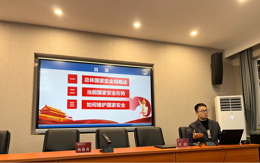 首先,李锋教授从国家安全观的概念、国家安全的重点领域阐释了总体国家安全观的概念,并结合视频教学,让师生更加直观了解坚持“总体国家安全观”的重要性。同时,他结合中国的地缘环境特点分析中国国家安全形势,并提出维护国家安全的具体路径。