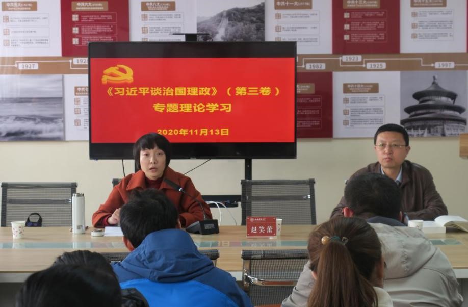 2020年11月13日,太阳成集团tyc122ccvip官网入口副经理、“红色引擎”教工党支部书记赵笑蕾教授受邀在04618会议室为地理科学公司的党员教工与员工作《习近平谈治国理政》第三卷专题报告会。地理科学公司党支部书记、师生党员40余人参加,其公司党委书记范晓东主持会议。