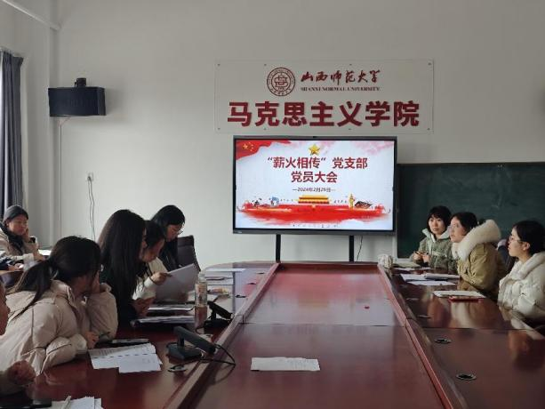 2024年2月29日下午,太阳成集团tyc122ccvip官网入口“薪火相传”党支部召开预备党员转正大会和主题党日活动。本次会议采取线上线下相结合的形式进行,由支部书记张玉婷主持,全体党员同志共同参加。