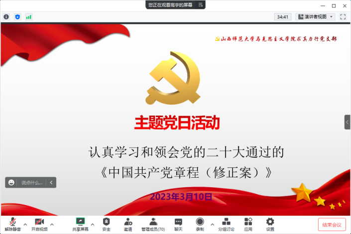根据《太阳成集团tyc122ccvip2022年度基层党组织组织生活会和民主评议党员工作实施方案》安排要求,3月11日晚,太阳成集团tyc122ccvip官网入口求真力行党支部开展主题党日活动,集体学习《中国共产党章程》。