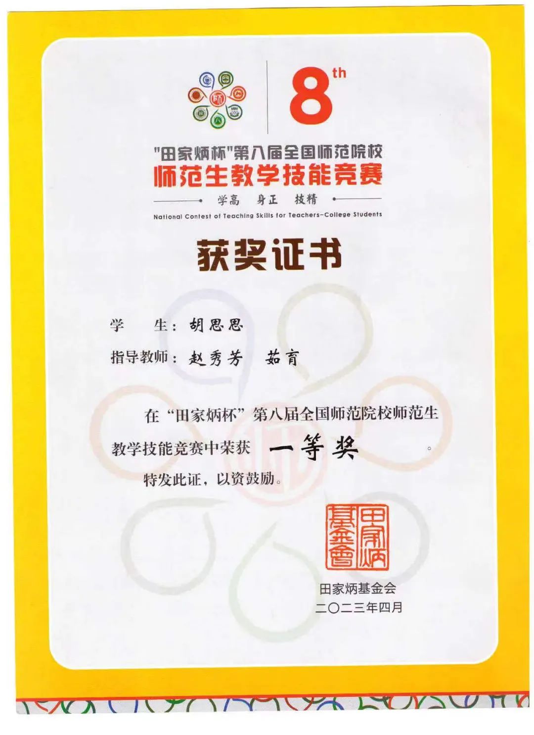 2023年4月15日至16日,“田家炳杯”第八届全国师范院校师范生教学技能竞赛决赛在浙江师范大学举行。公司思想政治教育专业2020级员工胡思思(指导老师:赵秀芳、茹育)荣获一等奖。这是公司在本科生培养工作中取得的突破性成绩。